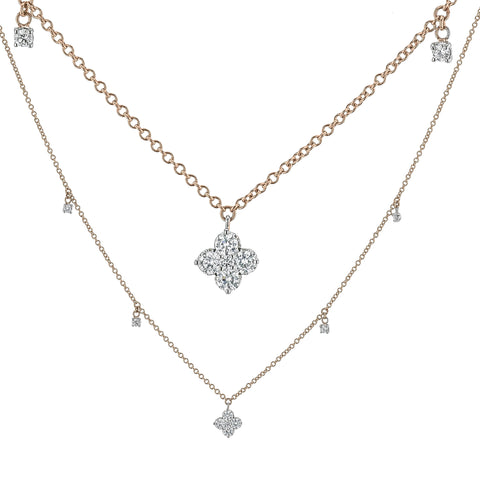 This layered necklace features two delicate white gold chains adorned with sparkling diamond accents. The shorter chain showcases a diamond cluster pendant, while the longer chain is sprinkled with small diamond drops for an elegant, cascading effect.