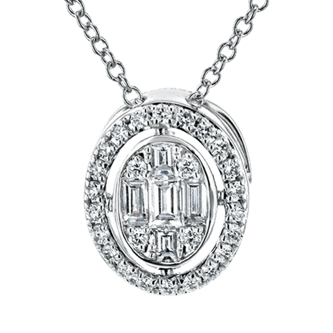 This rose gold pendant features a striking oval halo of round diamonds encircling a center cluster of baguette and round diamonds, creating a timeless, vintage-inspired silhouette with modern brilliance.