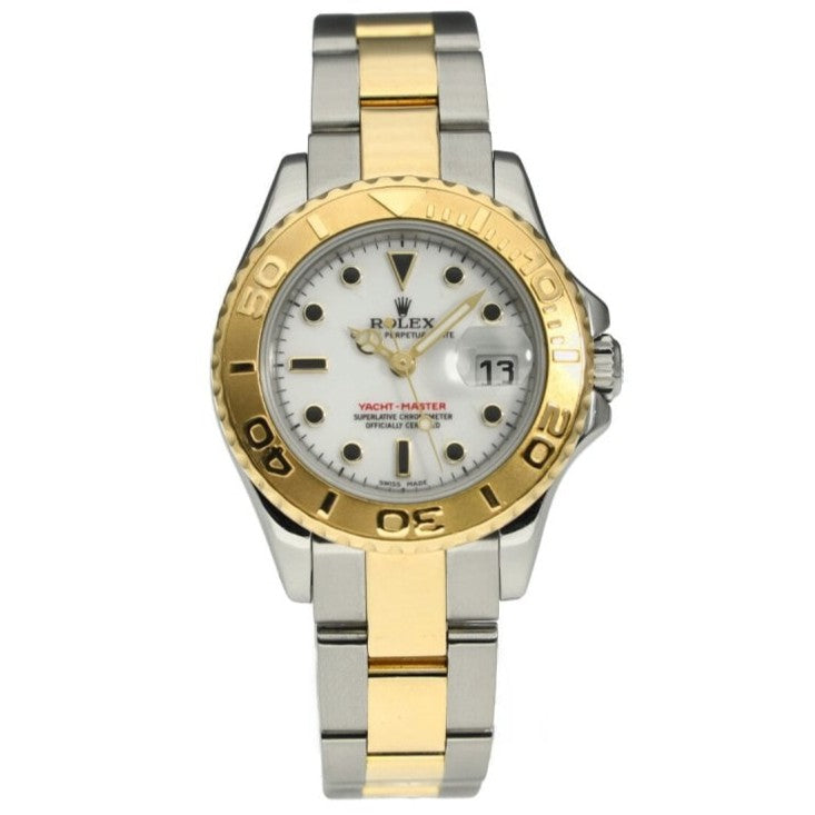 The Rolex Yacht-Master is the perfect watch for those who love the outdoors and being on the water. It is made with a stainless steel case and an 18k yellow gold bezel, as well as a steel dial. The date is displayed at the 3 o'clock position under the cyclops lens, and the yellow gold and steel oyster bracelet completes the look. This watch is powered by a self-winding automatic movement and is chronometer certified.