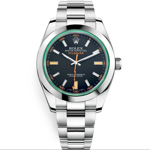 This Rolex Milgauss 116400V  has a black baton dial and a bracelet strap. This Rolex has undergone a thorough inspection of water resistance, accuracy, functionality and condition to determine the level of reconditioning required to meet our strict standards. It has also been referenced against technical documents and manufacturer records where available to ensure authenticity and a clean history. This Rolex comes with original card, box and tag complete. Pre-Owned like new conditions 2009.