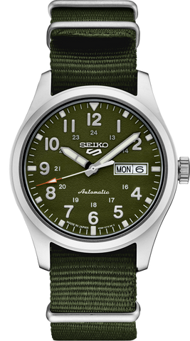 Seiko 5 Sports. Inspired by classic field/military design, this stylishly retro watch offers authentic lines with both durability and all-day excellence. Providing automatic technology that you control with every movement, this versatile watch is powered by a 24-jewel movement that beats at a frequency of 21,600 vibrations per hour, with a power reserve of approximately 41 hours and manual winding capability. The green dial features Arabic numerals, a day/date calendar, red-orange tipped second hand, and luminous hands and markers. Crafted of stainless steel with green nylon strap and a screwdown see-through caseback for a view of classic timekeeping in action. 10 bar, 100M Water Resistant