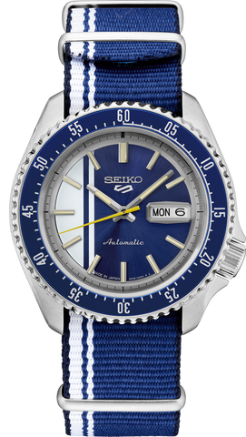 Seiko 5 Sports U.S Special Creation. With vivid colors and bold design inspired by the stripes of vintage race cars, this dynamic watch delivers both memorable styling and durability. For added impact, the blue and white stripes flow from the dial to the coordinated nylon strap, sized to fit easily over a racing uniform. Framed by a blue uni-directional rotating bezel, the dial also offers a day/date calendar, yellow second hand, and luminous hands and markers. Providing automatic technology that you control with every movement, this memorable timepiece is powered by a 24-jewel movement that beats at a frequency of 21,600 vibrations per hour, with a power reserve of approximately 41 hours and manual winding capability. The case, in stainless steel, includes a screwdown see-through caseback for a view of classic timekeeping in action. 10 bar, 100M Water Resistant