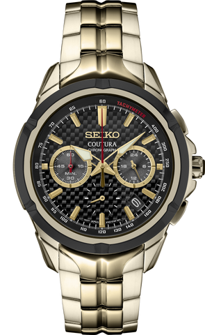 From the Coutura Collection. Delivering the perfect blend of technology and design for those on the move, the Coutura Collection combines bold angularity and shading with superior timekeeping for effortless sport/dress style. Inspired by motor sports, with a new case and bracelet design incorporating the angles and edges of racecar architecture, this dashingly sculpted chronograph features a multi-layer carbon-fiber patterned black dial with prominent 24-hour and chronograph minutes subdials at 3 and 9 o’clock styled to suggest a dashboard, tachymeter outer ring, date calendar, red chronograph hand, and LumiBrite hands and markers. Applied markers and subdial rings add a rich dimensionality, while the grooved black bezel provides a sense of propulsive action. Crafted of stainless steel in a light gold finish, this dynamic watch includes a sapphire crystal, screwdown caseback, tri-fold push button release clasp and classic cabochon crown. The chronograph function offers timing to 60 minutes in 1/5-second increments with split time measurement. 10 bar, 100M Water Resistant