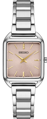 From the Essentials Collection. With a fresh square case design, this light and slim watch is proportioned for a perfect fit. The contemporary muted mauve pink die-stamped grid pattern dial and subtly textured markers add a hint of sophisticated luxury. Crafted of stainless steel with tri-fold push button release clasp. 5 bar, 50M Water Resistant