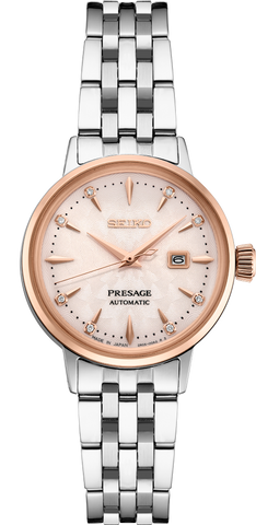 Seiko Presage Cocktail Time. Offering the finest in Japanese mechanical watchmaking, the Presage Collection blends precision technology with superior craftsmanship and design. Inspired by the vibrance of the city's modern lounges, the newest Cocktail Time designs express the excitement of today's Tokyo, with fresh styling and colors. With 8 diamonds adding sparkle to a pale pink dial with pressed pattern, gloss finish, and rose gold accents, this exquisite timepiece evokes the Pink Lady cocktail. Sleek and elegant, the gracefully slender case houses the new, thinner caliber 21-jewel automatic mechanical 2R05 movement, which beats at a frequency of 21,600 vibrations per hour, with a power reserve of approximately 41 hours and manual winding capability. The beautifully tapered five-row bracelet features a mirror finish for additional brilliance. Crafted of stainless steel, with rose gold finish bezel and crown, date calendar, box-shaped crystal, screwdown caseback, and deployment clasp with push button release. 5 bar, 50M Water Resistant