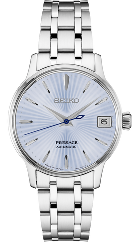 From the Presage Cocktail Time Collection. Offering the finest in Japanese mechanical watchmaking, the Presage Collection blends precision technology with superior craftsmanship and design. Inspired by the delights of a cocktail bar, this sophisticated watch features an ice blue dial with pressed pattern, gloss finish and date calendar. The 23-jewel movement, with manual and automatic winding capability, beats at a frequency of 21,600 vibrations per hour, with a power reserve of approximately 41 hours. Crafted of stainless steel, this elegant timepiece includes a box-shaped crystal, screwdown see-through caseback, and double deployment clasp with push button release. 5 bar, 50M Water Resistant