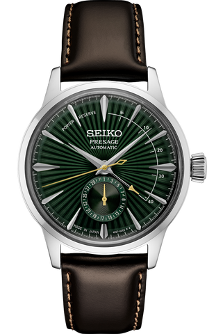 Seiko Presage Cocktail Time. Offering the finest in Japanese mechanical watchmaking, the Presage Collection blends precision technology with superior craftsmanship and design. Inspired by the vibrance of the city’s modern lounges, the newest Cocktail Time designs express the excitement of today’s Tokyo, with fresh styling and colors. Highlighted by a rich green dial with pressed pattern and gloss finish evoking the Mockingbird cocktail, this elegant design includes a power reserve indicator and date subdial. The 29-jewel automatic movement, with manual winding capability, beats at a frequency of 21,600 vibrations per hour, with a power reserve of approximately 41 hours. Crafted of stainless steel, with brown leather strap, this distinctive timepiece includes a box-shaped crystal, screwdown see-through caseback, and tri-fold push button release clasp. 5 bar, 50M Water Resistant