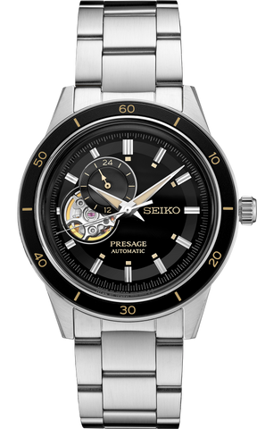 Presage Style ’60s Collection. Offering the finest in Japanese mechanical watchmaking, the Presage Collection blends precision technology with superior craftsmanship and design. With broad angular lines and such vintage details as box-shaped crystals, faceted indices and sharp hand design, plus the use of neutrals and earth tones, the Style ’60s collection creates a warm, retro feel perfect for today. Celebrating the fresh spirit of the 1960s, the collection takes particular inspiration from Seiko’s 1964 “Crown Chronograph,” Japan’s first watch with a stopwatch function. The black open-aperture dial, featuring a 24-hour subdial and beige Lumi-Brite hands and markers, offers a view of the 24-jewel movement, which beats at a frequency of 21,600 vibrations per hour, providing a power reserve of approximately 41 hours and manual winding capability. Crafted of stainless steel, this distinctive timepiece includes a screwdown see-through caseback and tri-fold push button release clasp. 5 bar, 50M Water Resistant
