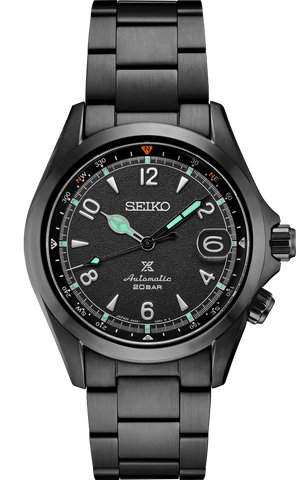 Prospex Alpinist Black Series Limited Edition. Designed for those who treat life as the ultimate adventure, the Seiko Prospex line meets every challenge with technological excellence and style. Part of a rich legacy of innovation in high-intensity timekeeping, Prospex continues to celebrate a long history of sports watch excellence with recreations and reinterpretations of landmark achievements. Based on Seiko's first sports watch, the 1959 Alpinist, this extraordinary Black Series Limited Edition, available only in a controlled production run of 5,500, expresses the view seen through a night vision scope, offering a black dial and hands and markers with Seiko's brighter and longer lasting "Green LumiBrite Pro," suitable for professional usage and providing maximum visibility with the color most recognizable in the dark. Designed for a wide range of adventure activities, this exceptional timepiece, in stainless steel with black hard coating, includes a rotating inner compass ring, magnified date window, sapphire crystal with anti-reflective coating on the inner surface, screwdown crown and see-through caseback, and tri-fold push button release clasp. The 24-jewel automatic movement beats at a frequency of 21,600 vibrations per hour, with a power reserve of approximately 70 hours and manual winding capability. Packaged in a Limited Edition collectors' box. 20 bar,200M Water Resistant