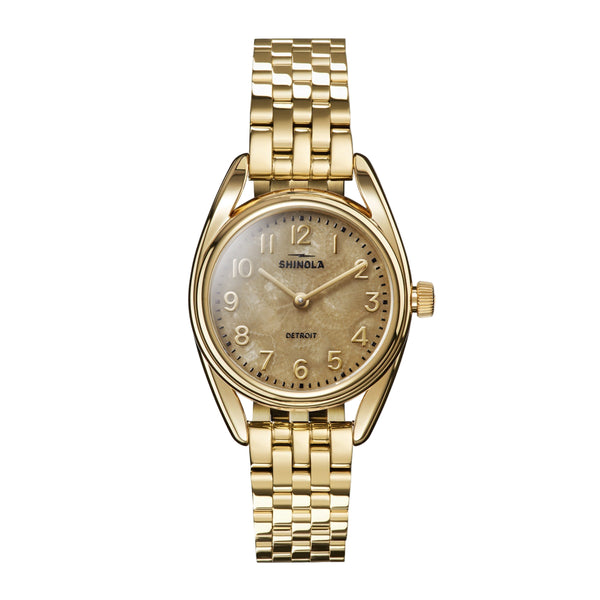 The perfect showcase for a one-of-a-kind stone, Derby’s case wraps elegantly around the Petoskey dial like two horseshoes. The Petoskey stone is a treasure sought out by many who visit the beaches of northern Michigan. Varied on the surface, each stone is a fossil of colonial coral believed to have lived in waters more than 350 million years ago—and no two are alike. Slim gold hands and polished gold numerals complete the look. A five-link bracelet, crafted from PVD gold stainless steel, makes this Derby a true winner with an everyday elegance.