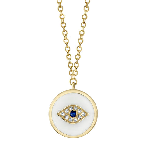0.02CT DIAMOND & 0.02CT BLUE SAPPHIRE & WHITE ENAMEL 14K Y/G EYE NECKLACE