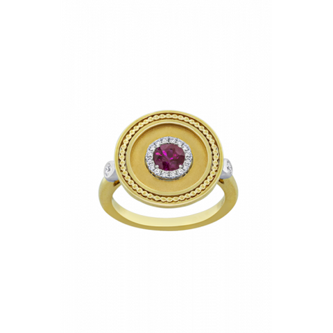 This sensational fashion ring from Spark Creations can instantly instill confidence in the wearer. This gemstone and halo fashion ring complements almost any texture. High-quality 18k white gold and 18k yellow gold ensures your jewelry can withstand normal wear and tear. A wonderful ruby center stone displays a wonderful stream of light during the day or night. A beautiful setting safeguards the round center stone. AZZI Jewelers in Lansing, Michigan stocks luxury fashion rings from from today's best designers. Contact us online or over the phone for more information, or visit our showroom and see this piece for yourself!