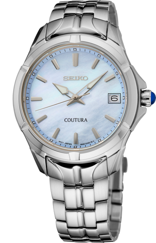 From the Coutura Collection. Expressing a polished and modern sophistication, the Coutura Collection combines bold angularity and elegant design with superior timekeeping for an effortless sport/dress aesthetic. This versatile timepiece, perfect for day-to-night style, features a shimmering pale blue mother-of-pearl dial with silver applied indices, adding a rich 3-dimensional appearance to the elegant look. Crafted of stainless steel, with a perfectly proportioned case and bracelet for a streamlined fit, this graceful watch is topped with a scratch-resistant sapphire crystal and includes LumiBrite hands and markers, a date calendar, a classic cabochon crown, and a tri-fold push-button release clasp. 10 bar, 100M Water Resistant