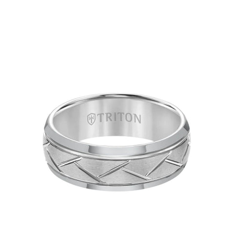 8mm Black Tungsten Carbide Domed Comfort Fit Band with alternating diagonal cuts and horizontal brush finish.