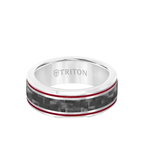8MM Tungsten Carbide Band with Carbon Fiber Insert, Fire Red Stripes and Beveled Edge