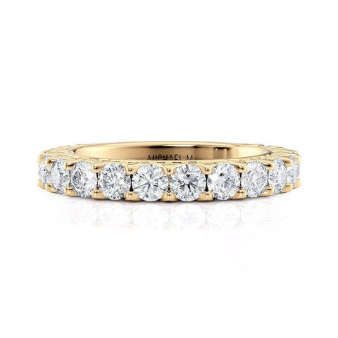 This MICHAEL M wedding band is adorned with diamonds handpicked by a certified MICHAEL M gemologist, each side stone has a minimum average color of G, a minimum average clarity of VS, and are hand-placed in an elegant prong setting by one of MICHAEL M’s master artisans.